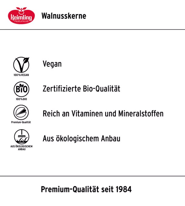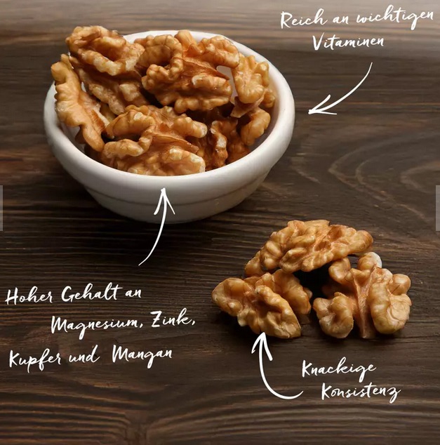 Walnusskerne sind ein wahres Nährstoffwunder! Die knackigen Nüsse besitzen einen hohen Gehalt an Vitamin E, B1, B6 und Folsäure. Sie sind reich an Magnesium, Zink, Kupfer sowie Mangan und enthalten Eisen und Kalium.